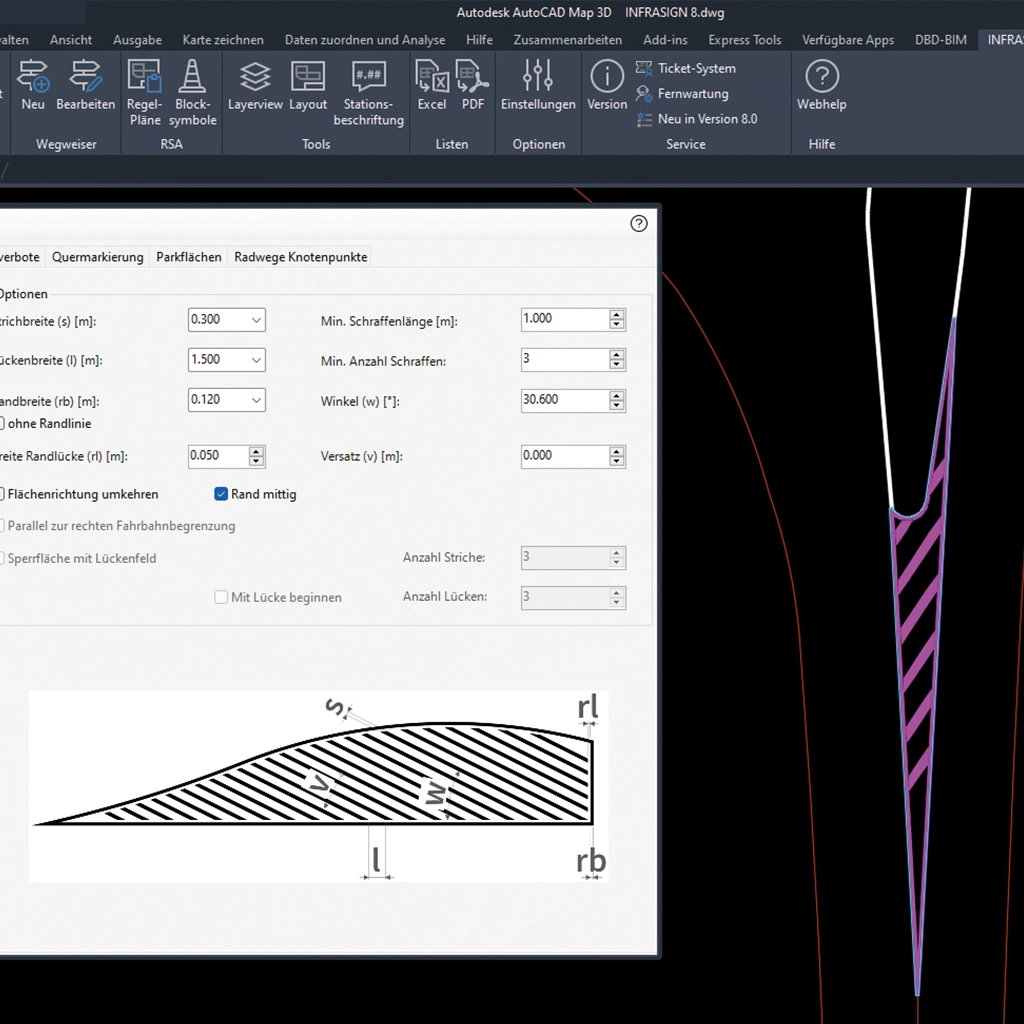 INFRASIGN stellt intuitive Werkzeuge für Sperrflächen, Längs- und Quermarkierungen sowie für Halt- und Parkverbote bereit. Zudem bietet die Software den vollständigen StVO-Katalog, um Schilder direkt im Plan zu platzieren. Ein integriertes Konstruktionsprogramm ermöglicht es, Wegweiser bei Bedarf individuell zu gestalten. Das Programm ist in Deutschland (StVO, RWB/RWBA), Österreich (RVS/BMVO) und der Schweiz (VSS) nutzbar, da es die länderspezifischen Richtlinien automatisch berücksichtigt.