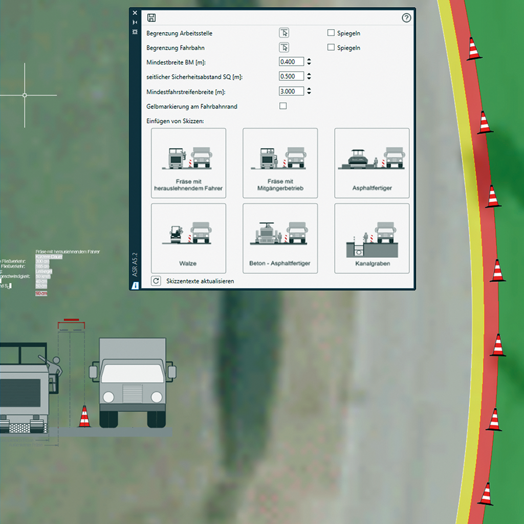 Legally compliant planning: Never again incorrect distances to the work area or the remaining carriageway width! The system automatically applies the requirements of the German ASR 5.2, displaying the minimum width (BM) and the lateral safety distance (SQ) directly in the plan. This ensures that the chosen separation elements are placed in the correct position – a huge advantage in the approval process.