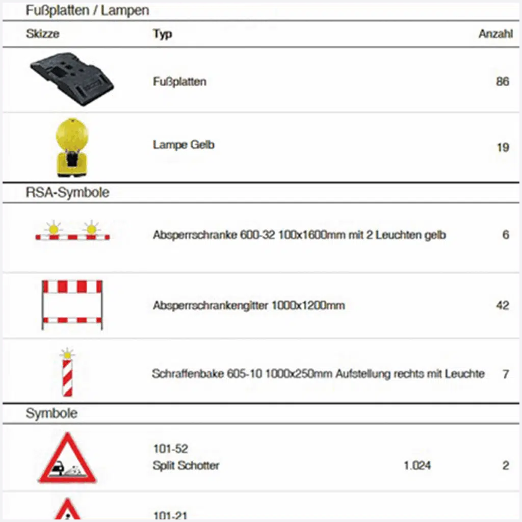 A real advantage in practice: INFRASIGN automatically generates a packing and loading list based on the true-to-scale plan. All required objects – from signs to beacons, barriers, and base plates – are reliably recorded. This ensures field staff always have everything on the truck, eliminating extra trips due to missing materials.