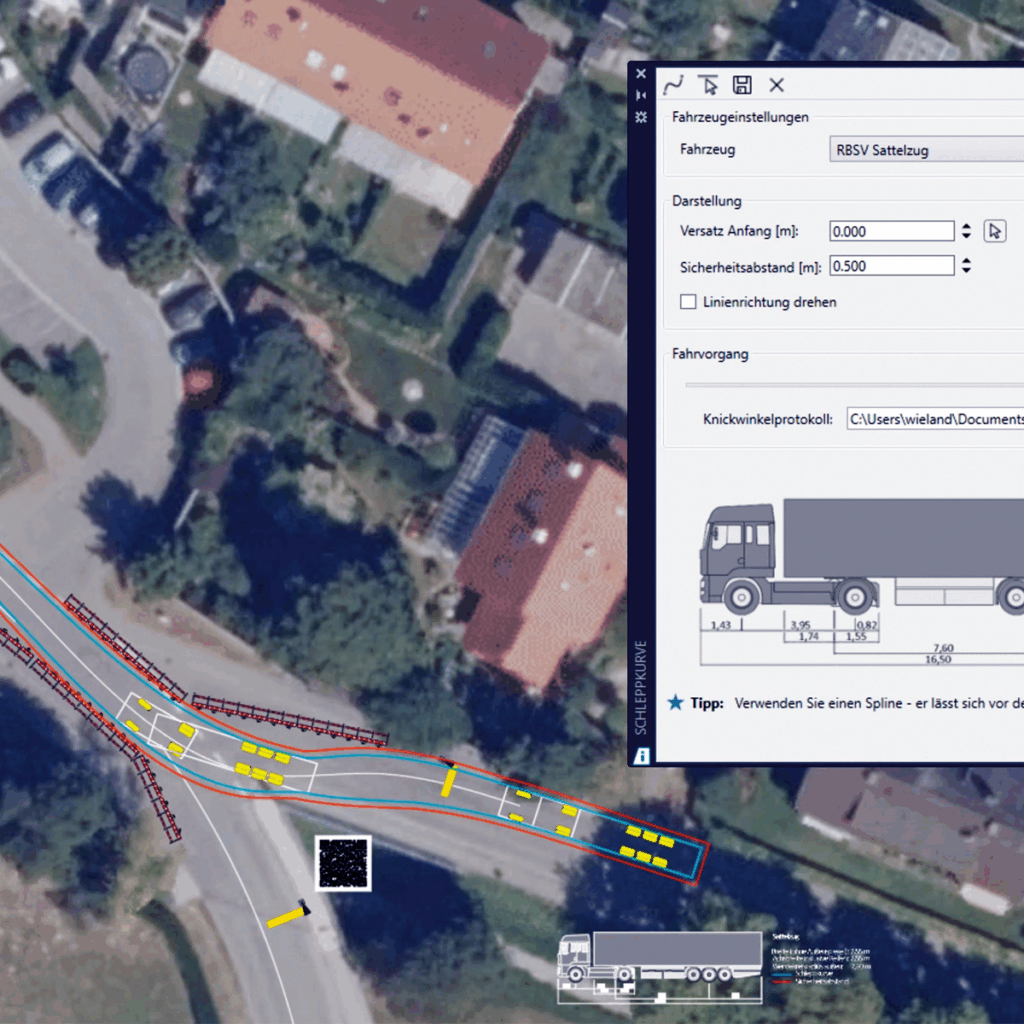 Especially when planning detours, for example for public transport, swept paths are crucial. Without a true-to-scale base map from WMS services, this is hardly feasible with traditional templates. INFRASIGN provides dynamic swept path analysis – fast and reliable.