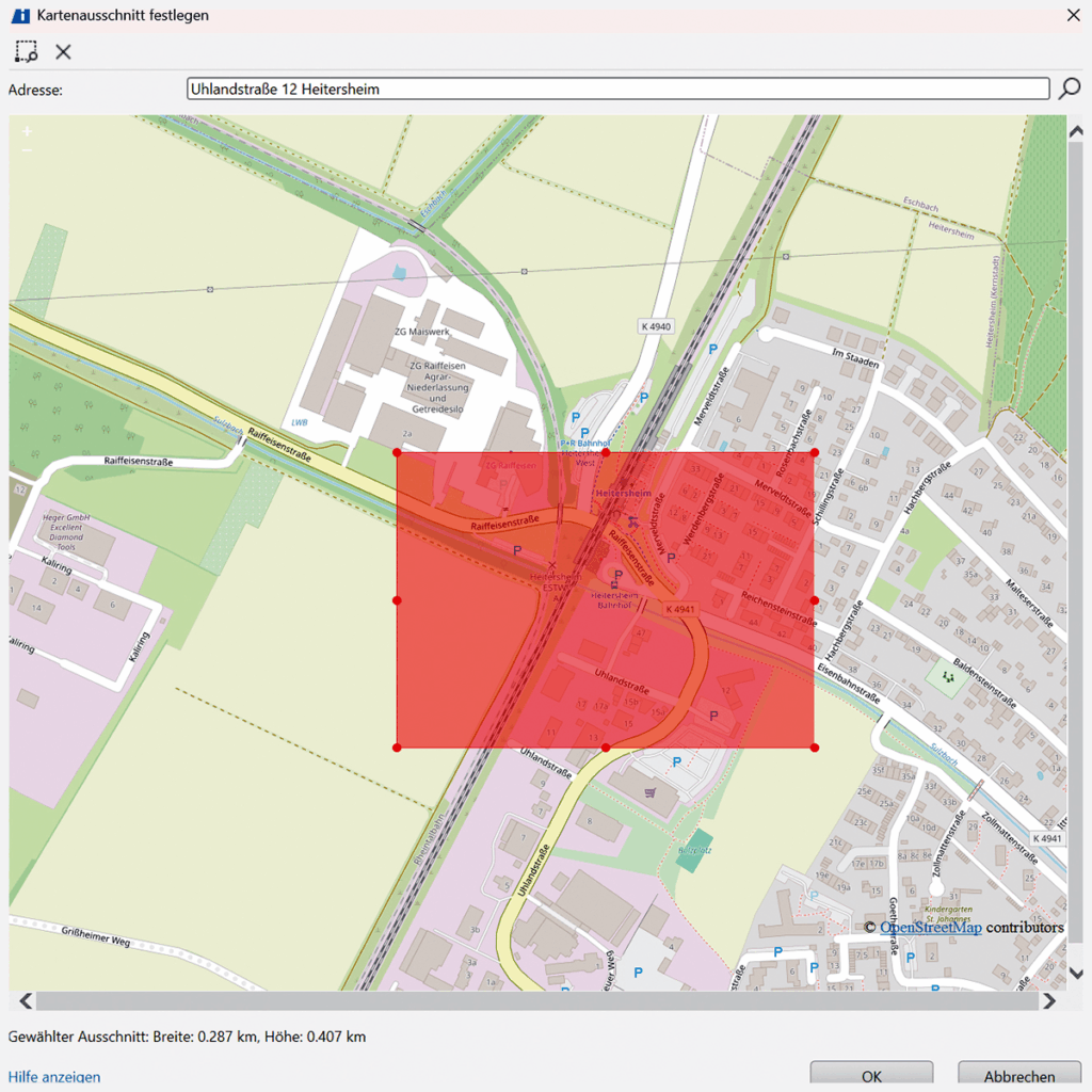 Leverage WMS services: With the map selection tool, you can directly integrate aerial imagery or cadastral sections from official WMS services provided by state surveying offices. Simply select the street and location, adjust the section, and download orthophotos or cadastral maps – complete with real coordinates.